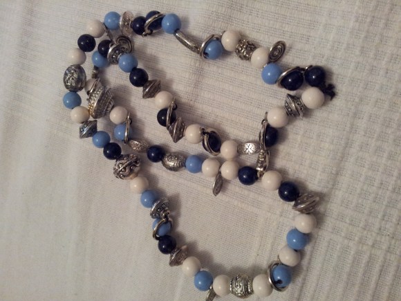 Außerdem war ich heute bei meiner persönlichen Bastel-, Näh – und überhaupt Fee Aniger, deren Vorrat an Bastelutensilien die DIY-Abteilung vom Thalia in den Schatten stellt. Während die anderen Ostereier beklebten, hab ich mich aufs Sofa zu den vielen Dosen voll mit Perlen verzupft und mich – ebenfalls in Erinnerung an den Urlaub – für Maritimes entschieden. Das Ergebnis: