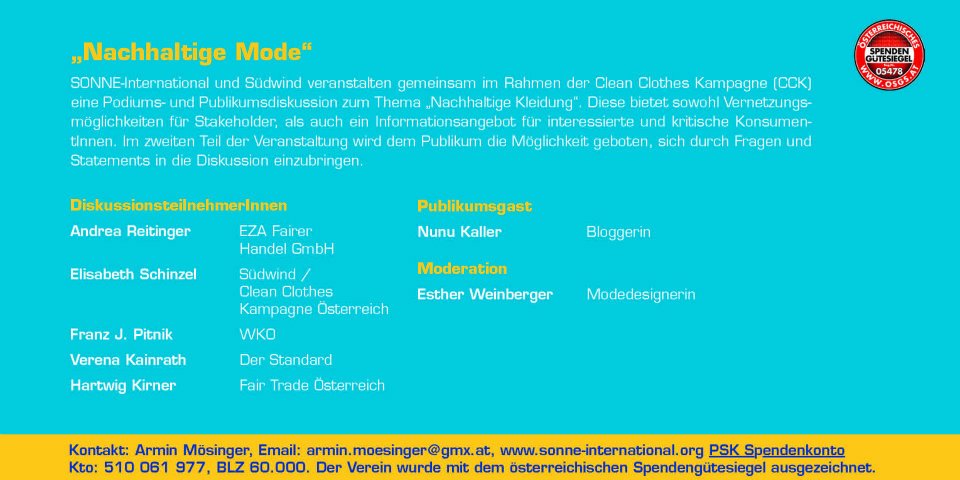 Die liebe Teresa von SONNE international hat mich als „Publikumsgast“ zu einer Podiumsdiskussion zum Thema „Nachhaltige Mode“ eingeladen. Ich freu mich sehr, bin schon sehr gespannt auf dieses Event – und würd mich über zahlreiches Erscheinen freuen!