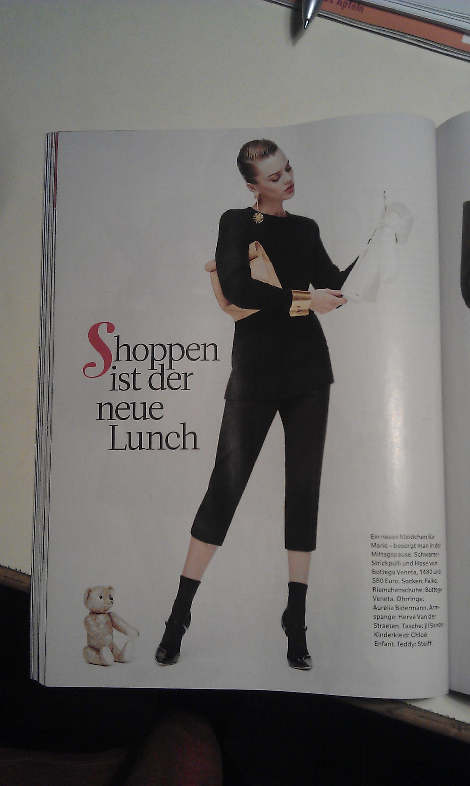 Ich mein ja nur….ist das nicht ein bissl gar oarg? „Shoppen ist der neue Lunch“ – und in der Hand hat sie obendrein Kindermode, damit ja die das lesenden Jungmamis auch drauf abfahren. Aber ich weiß, ich weiß, ich reg mich da viel zu sehr auf, und objektiv gesehen ist das im Grunde nur ein Ausdruck dessen, was man in so ziemlich allen Magazinen dieser Art jeden Monat neu vorfindet. Aber. AAAAAAAAAAAAAber.