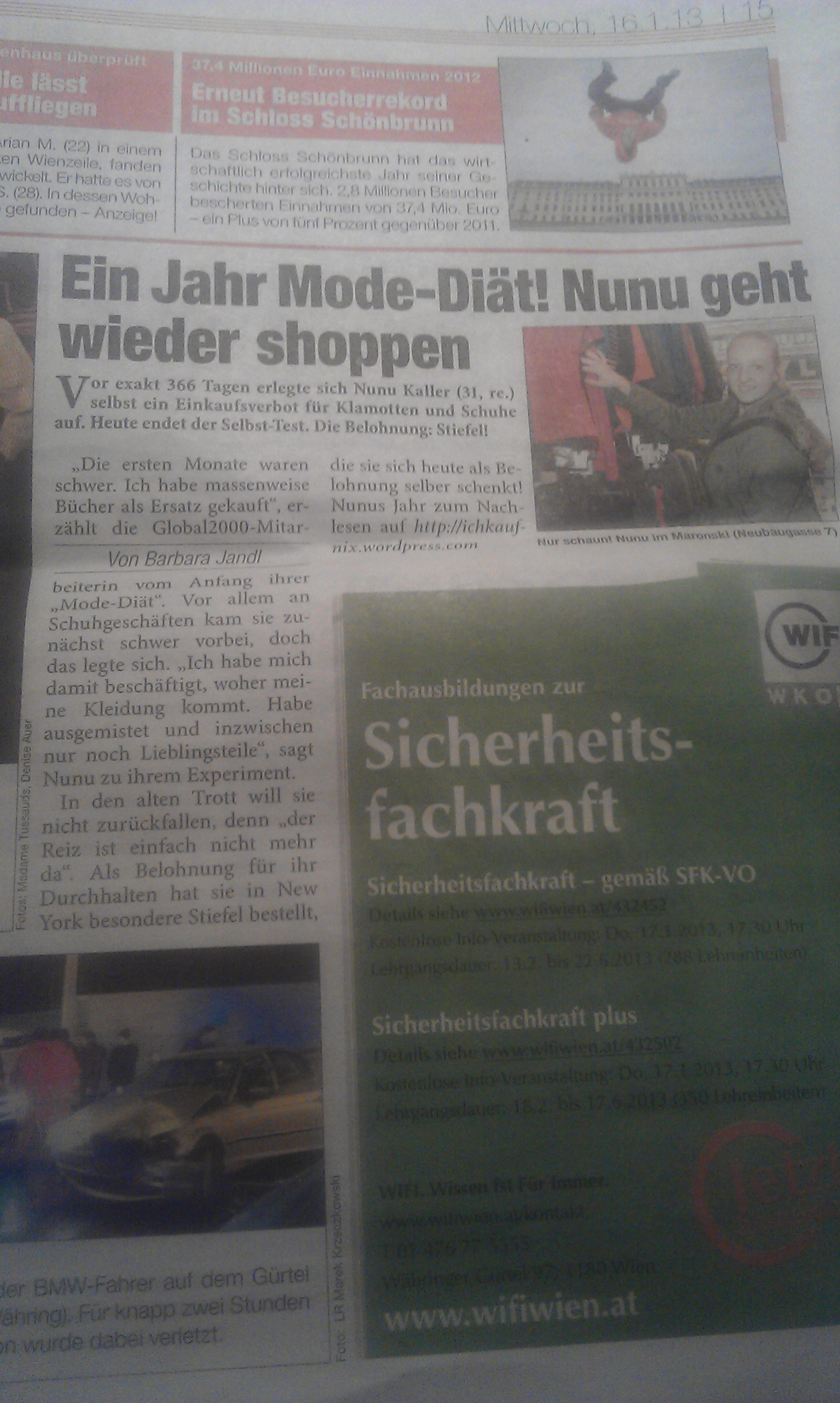 Das Sahnehäubchen, sozusagen: Artikel 20 und 21 plus ein Radiobeitrag! Nein, ich bin nicht überrascht, ich wusste, dass die kommen (nona, weil Foto und Interview und so). Aber ganz ehrlich, so unter uns, in den vergangenen Monaten hab ich immer gesagt, ich will nicht missionieren. Aber dass durch diese eigentlich absurd hohe Medienaufmerksamkeit und den Blog sich wenigstens noch ein paar Leute mehr damit auseinandersetzen, wie es in der konventionellen Modeproduktion zugeht und welche Alternativen dazu es gibt: Juhu! Gut so! Freut mich! HIER gehts zu den (noch nicht ganz fertig geschriebenen) Grauslichkeiten, HIER zu den alternativen Einkaufstipps!