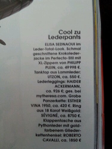 Heute früh bekam ich wiedereinmal eine InStyle zwischen die Finger. Drinnen: Eine Fotostrecke nur mit Lederjacken. Alle so ein- bis fünftausend Euro. Ich habe mich immer schon gefragt, wer so viel Geld hat. Solche Leute sehe ich sonst nur im Fernsehen und sie haben aufgespritzte Lippen oder schreien laut Roooooobert oder beides. Neid ist das keiner, selbst bei einem Monatseinkommen im sechsstelligen Bereich wär mir eine Jacke (!) doch niemals mehrere tausend (!) Euro wert.