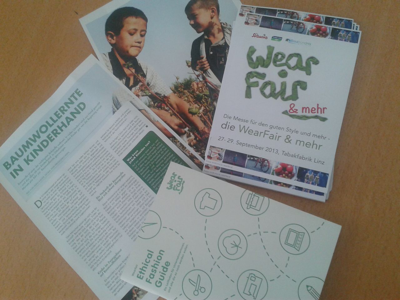 Ein Artikel in unserem Mitgliedermagazin, den GLOBAL NEWS, über die Baumwollernte in Usbekistan, der Flyer für die WearFair & mehr, den ich heute Nachmittag austeilen werden, und einige Ausgaben des Ethical Fashion Guides. Und all das gehört zu meinem Job.