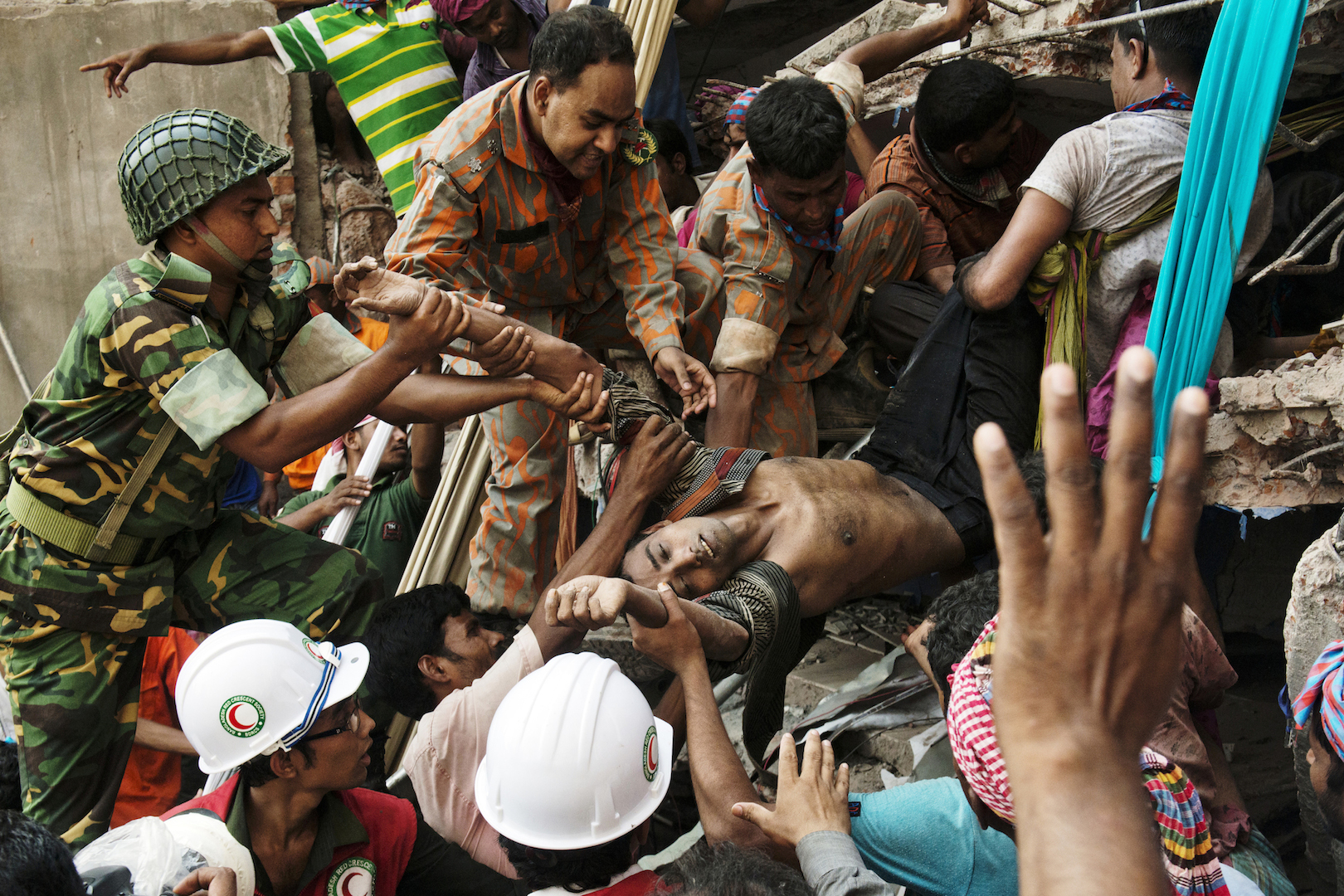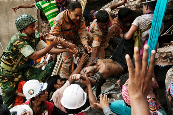 A Bangladeshi woman survivor is lifted out of the rubble by rescuers at the site of a building that collapsed in Savar, near Dhaka, Bangladesh, April 24, 2013.