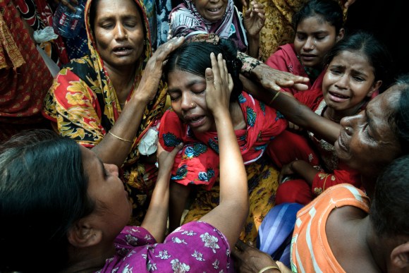 Women cry after identifying the body of her husband at a makeshift morgue near the site of a building collapse in Savar, near Dhaka, Bangladesh.