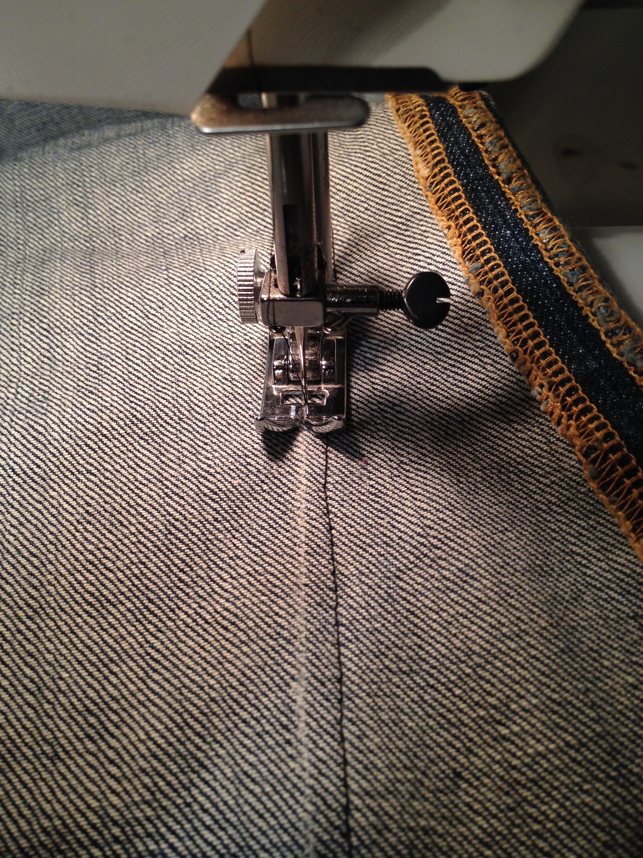 Zack, Jeansnadel rein, Naht markiert und los gings. Am rechten Bein gings zweimal los, da ich zuerst etwas zu weit genäht hatte. Was aber gut war, beim ersten Mal hatte ich aufs Fotografieren vergessen.