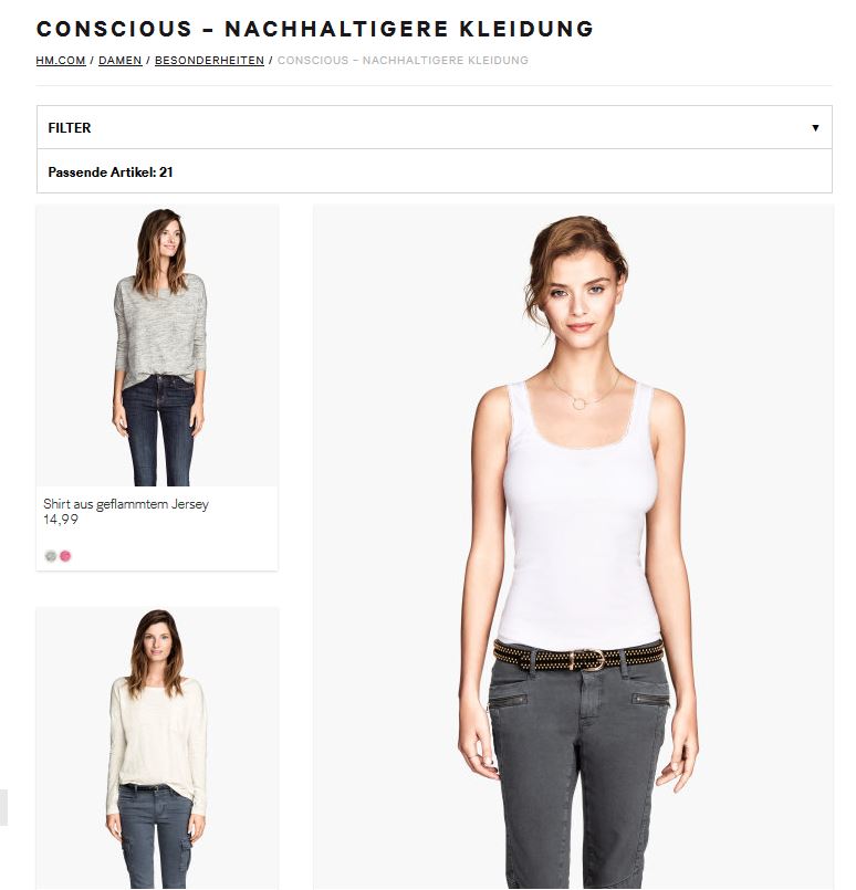 So. Für alle, die glauben, der Textilschwede macht uuuurviel auf nachhaltig und boah, die Conscious Collection, hey, die tun ja was und ursuper und im Grunde kamma da ja eh hingehen, weils dort schon ansatzweise öko zugeht, hab ich jetzt zwei Screenshots, die ich vom österreichischen Onlinestore des schwedischen Textilriesen gemacht hab. Ich bitte, auf die Zahlen links oben zu achten.