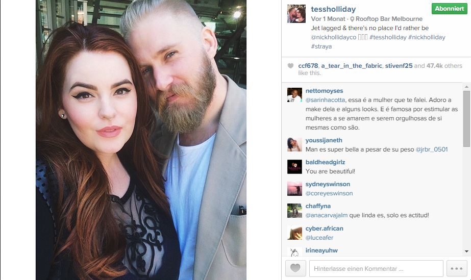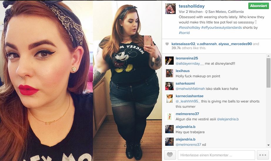 Frauen wie Tess Holliday sind da wirkliche Vorkämpferinnen, die allerdings aufpassen müssen, dass sie von Industrie und Werbung nicht ins Kuriositäteneck gedrängt werden. Es muss sich wirklich was tun. Aber am besten wäre es, wenn sich etwas in Richtung GESUNDE und natürliche Körpermaße tut. Weder Hollidays Übergewicht noch das klassische modelsche Untergewicht sind gesund. Hoffen wir, dass sich da in den nächsten Jahren was bewegt.