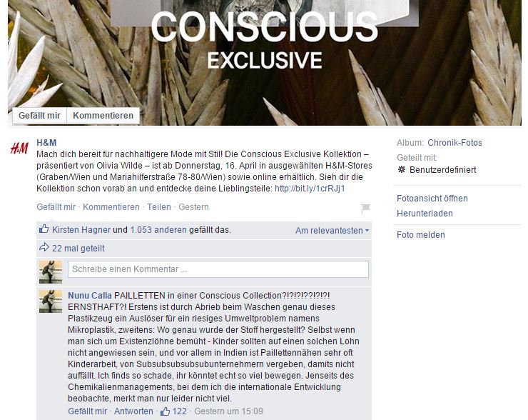 Sei doch lieber froh, dass das Bewusstsein dafür steigt. Klar kannst du kritisch sein, aber ermutige die Leute doch lieber wenn H&M, dann Conscious zu kaufen, denn wenn H&M merkt, dass es ankommt, wird noch mehr in die weitere Entwicklung investiert…