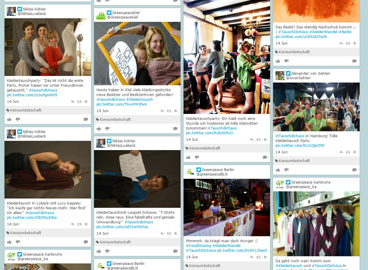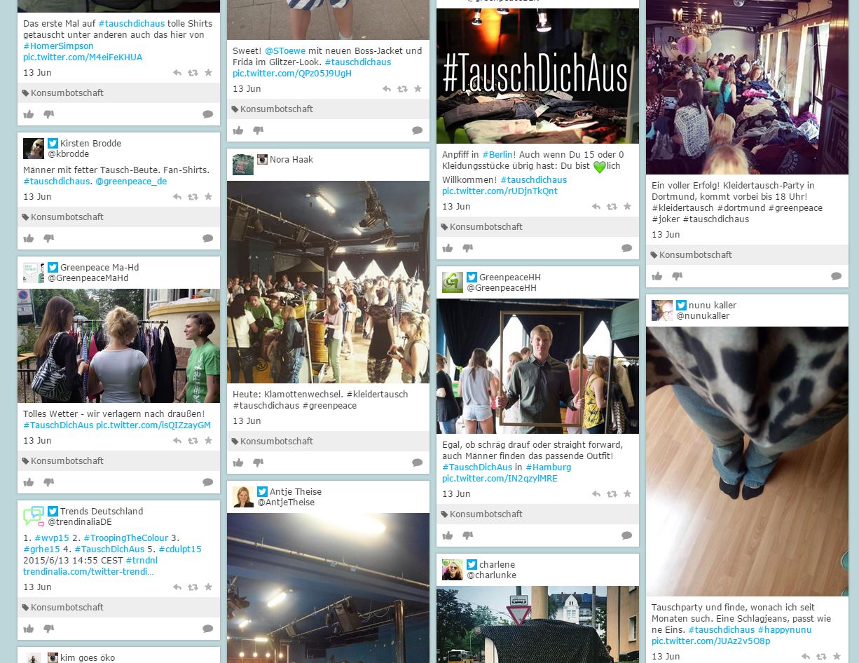 Wir – also Hanno aus dem Hamburger Büro – haben einen sogenannten Stackla auf der Konsumbotschafterseite angelegt, wo alles von Facebook, Twitter, Instagram und so weiter reingeschneit ist, was mit dem Hashtag #tauschdichaus ausgestattet war.