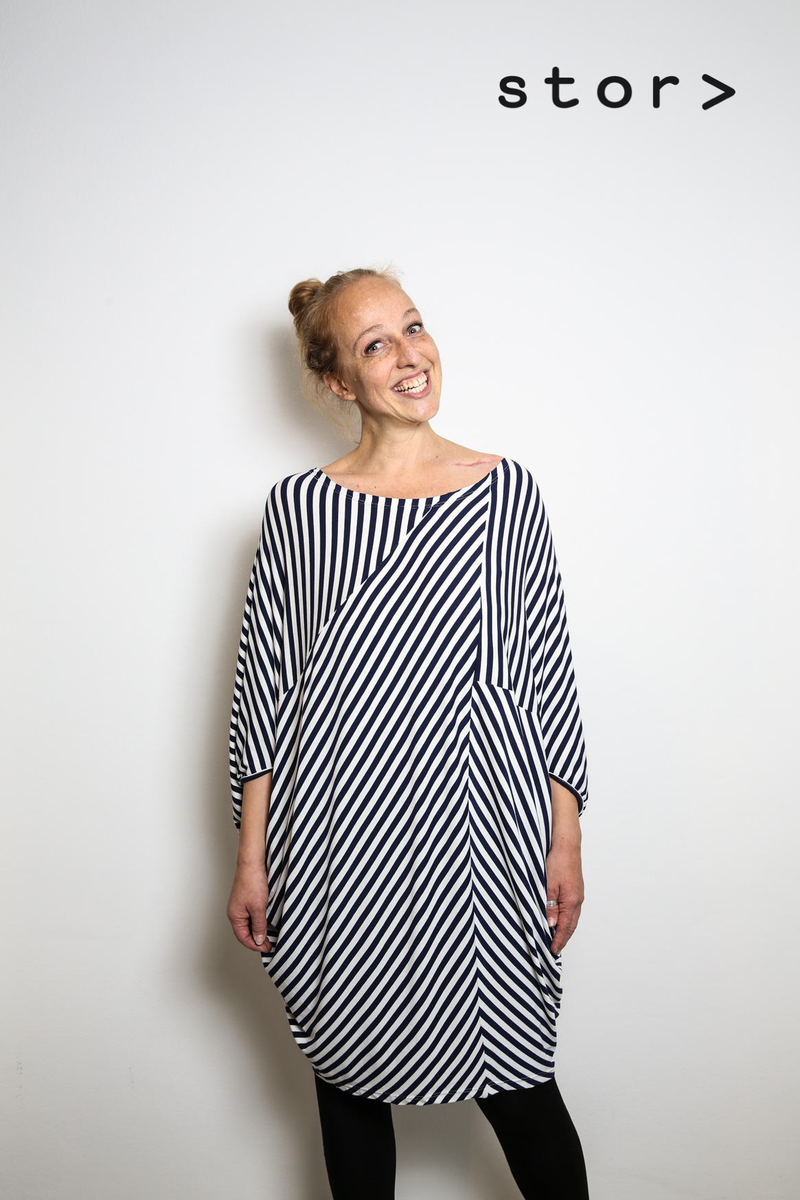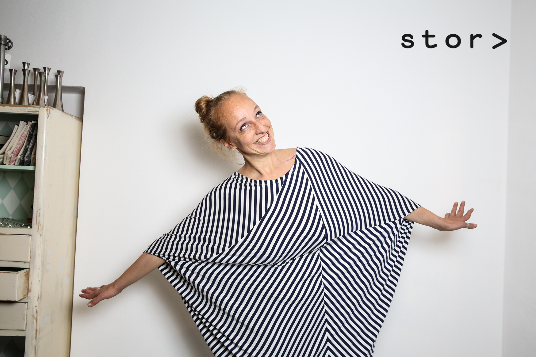 Ich hab ja schon mal über den Stor> geschrieben – dort gibts Plus Size Mode. Gaby fährt jedes Jahr auf spezielle Messen und sucht dort ihr kommendes Angebot aus (so wie es auch alle Green Concept Stores machen, die ich kenne), und das ist dann meistens recht fesch, weil Gaby einen guten Modegeschmack hat. Jedoch: Diese Teile sind dann konventionell produziert, halt in größeren Größen. Aaaaaaaber: Gaby entwirft auch selbst, und diese Teile werden dann bei Merit mitten im vierten Bezirk produziert. Merit ist toll: Das ist eine Einrichtung von der Volkshilfe, die per Näherei Langzeitarbeitslosen über fünfzig den Wiedereinstieg in die Arbeitswelt ermöglicht. Dort produzieren auch einige tolle ökofaire Labels wie etwa Göttin des Glücks (die wunderschöne Leinenkollektion), Milch oder die liebe Anna Pollack mit ihrer entzückenden Upcycling-Kindermode. Und Gaby also auch.