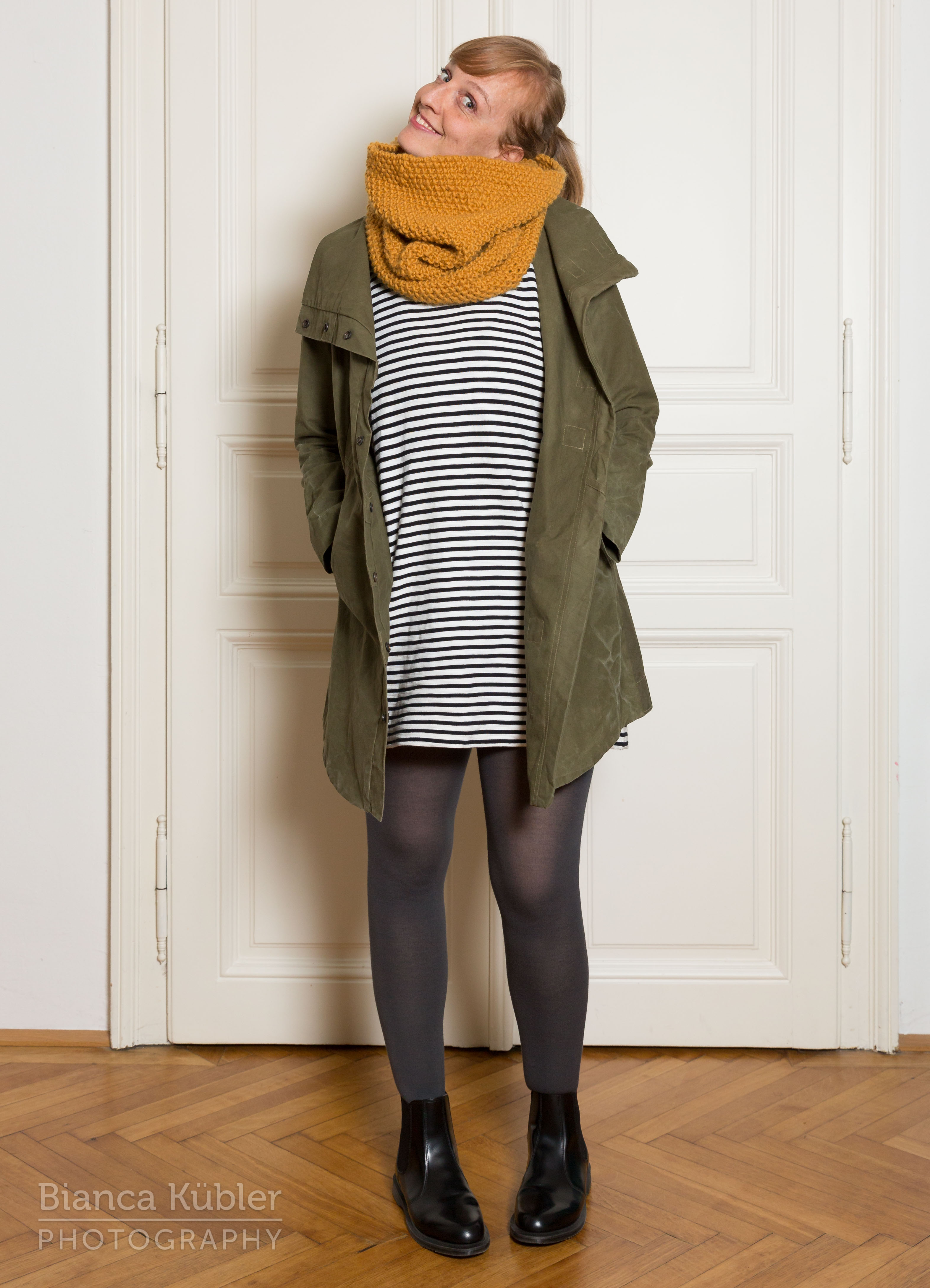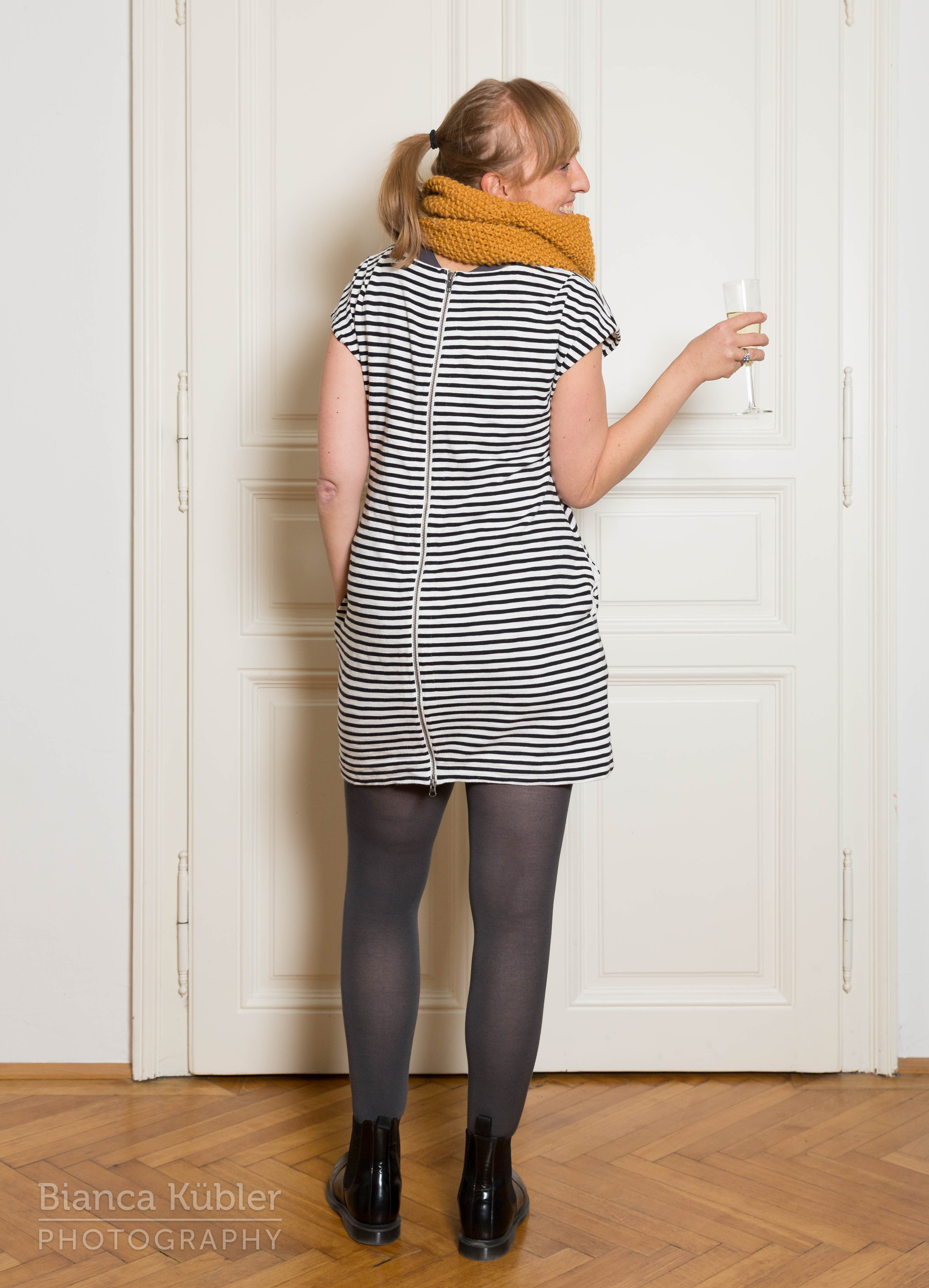 Ein Foto, das zu posten Überwindung kostet, es is schon a wengerl kurz, das Teil – aber Bianca wollte unbedingt den Zipp vom Kleid zeigen, der gefiel ihr so gut. Ich trag das Kleid übrigens normalerweise mit blickdichteren schwarzen Strumpfhosen oder Leggings und mit einem Langarmshirt drunter. Letztens wars ein gelbes Langarmshirt, was eine Kollegin gleich mal mit „Biene Maja“ kommentierte.