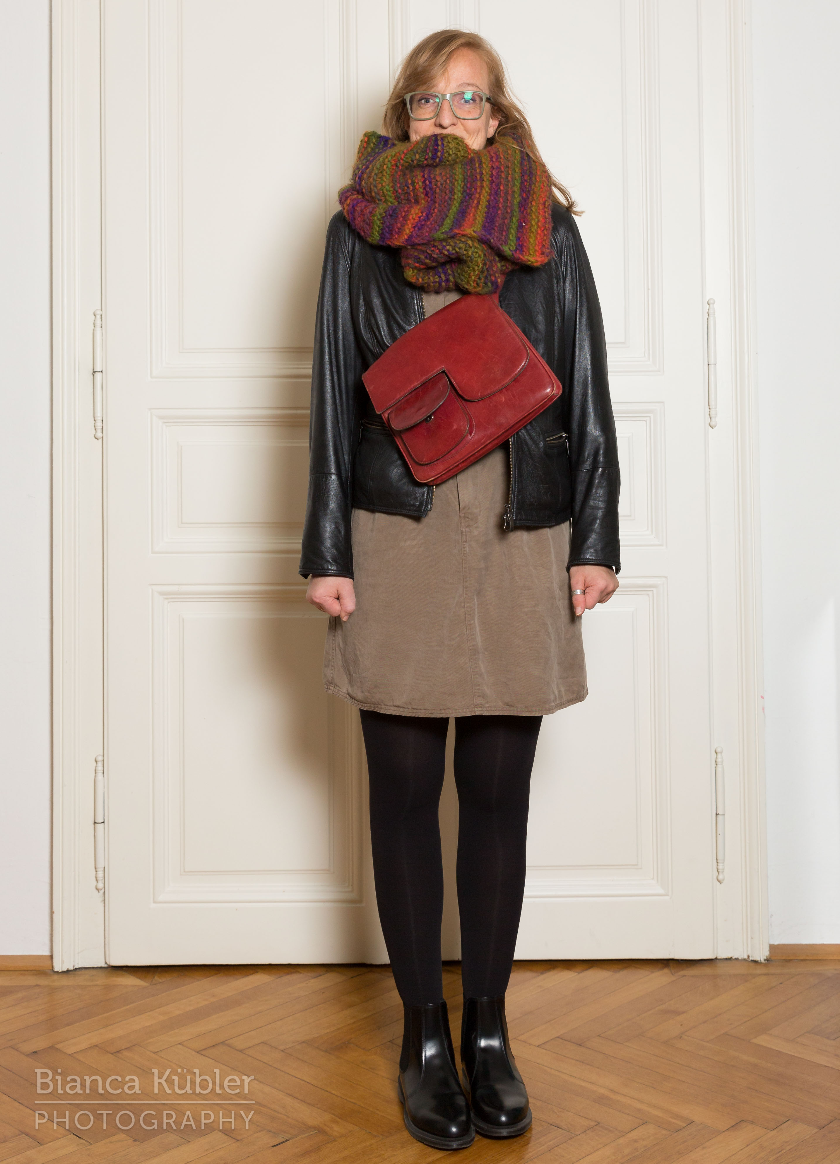 Heute nochmal das Kleid von gestern – auf winterlich kombiniert und in dieser Kombi von mir kürzlich getragen. Die Jacke: So weiches, dünnes Leder, dass ichs für Kunstleder gehalten habe am Flohmarkt bei Ulrike (übrigens echter Geheimtipp für Wienerinnen, sowohl für jene, die was loswerden wollen, als auch jene, die Second Hand kaufen wollen). Die Fragen, die ich mir beim Shopping immer stelle, konnte ich in diesem Fall mit JAAAA beantworten: Sie passt mir wirklich, ich wollte sie wirklich (eine schwarze Lederjacke stand bei mir seit 15 Jahren auf der Wunschliste), und ich brauchte sie, da meine graue Lederjacke, ebenfalls von einem Flohmarkt, an den Armen inzwischen mehr an Schmirgelpapier als an Leder erinnert und mir bereits eine Stofftasche echt ruiniert hat.