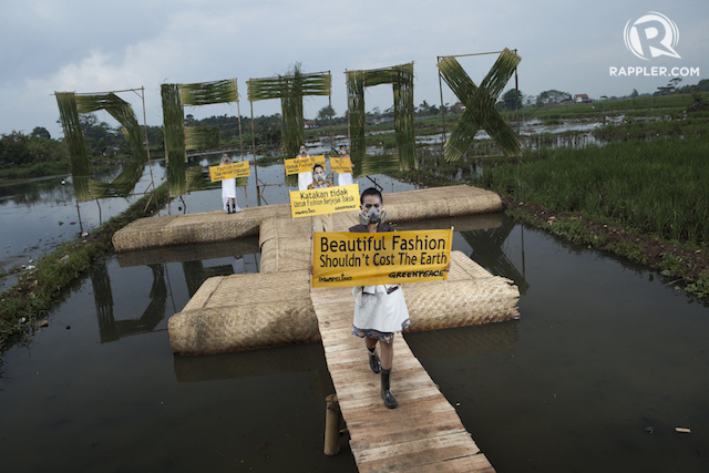 Indonesian models presenting Eco Fashion from 3 different designer Felicia Budi, Indita Karina, Lenny Agustin during „Detox Catwalk“ on damage paddy field area in Rancaekek, West Java province on Sunday 22 March 2015. Photo Greenpeace/Hati Kecil Visuals