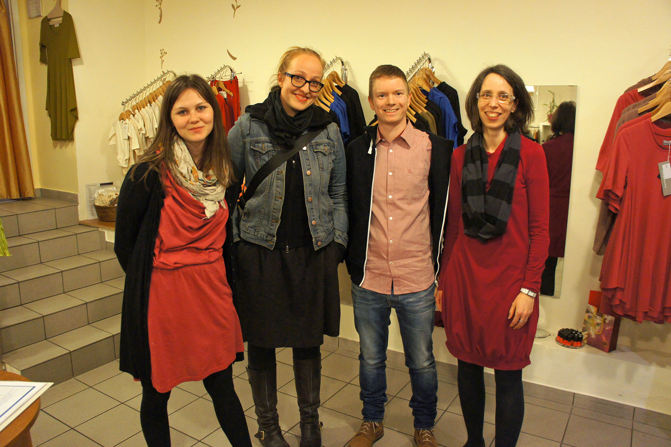 Ja, ich habe meine Hände in Rocktaschen. Gemütlichen, weichen, weiß getupften roten Taschen. Herrlich! Ansonsten sieht man nicht viel vom Kleid….dafür die Janna vom Xiling, den Flo vom Eco-Store und die Dame von Natürlich Baby, deren Namen ich vergessen hab, sssssssoooorrryyyy!!!! (c) Stern und Kringel