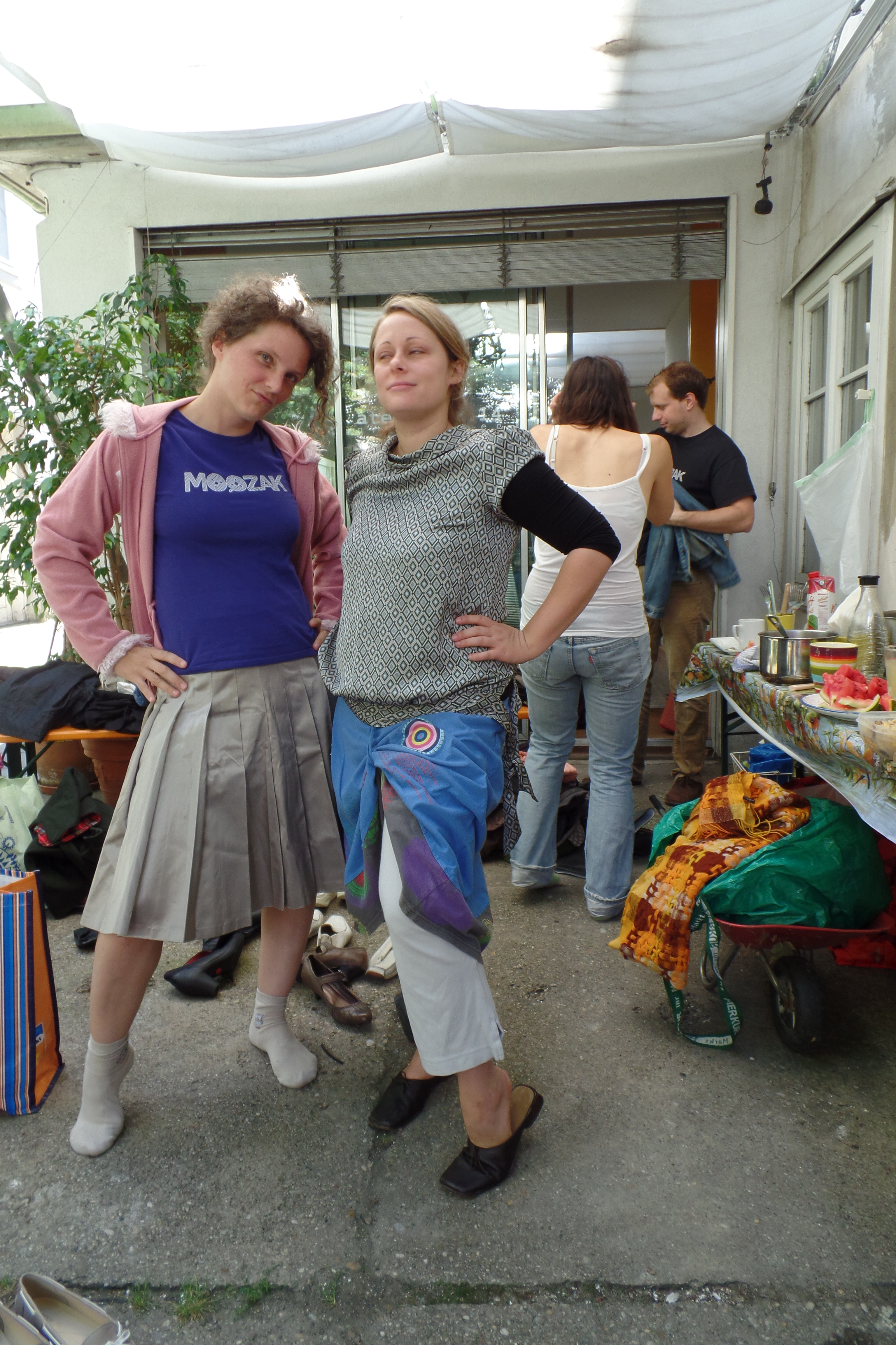 L. (ich hab aufgrund dieses Fotos versprochen, ihren Namen nicht auszuschreiben 😀 ), der Putzfrauenschreck. Auf dem Bild hat sie nur Tauschsachen an. Ich hab sie regelrecht angefleht, mindestens die Hälfte davon wieder auszuziehen, einfach nur des Anblicks wegen. Nein, sie ging sogar so Zigaretten holen. Mutige Dame! Mein Favorit der Rock, der war nämlich von „Cesigual“ (kein Tippfehler!)