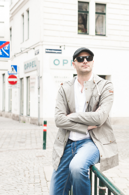 Bis auf die Kappe (Privatbesitz) ist alles, was er anhat, aus fairer und ökologischer Produktion. Inklusive Sonnenbrille. Jeans von Kuyichi, 99€ – weißes Hemd von Armed Angels, 79€, Parka von Armed Angels 199€ (gibts auch in einer weiblichen Version), Sonnenbrille 59 € – mit saucoolen Holzbügeln.